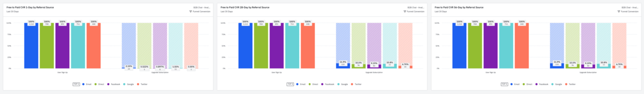 Free to Paid Conversion Rate by Referral Source (in 1, 28, 56 days): These charts show which acquisition channels bring in users most likely to convert to paid. Anomalies in individual channels require further investigation.