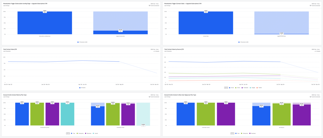 Geek Note: Combining metrics enhances insights. For example, high contact sales from a specific acquisition source and low conversion rates could reveal a channel bringing in low-quality leads. Similarly, combining upgrade and churn data with active account distribution can provide insights into plan/pricing optimisation. These relationships guide further analysis and unlock growth opportunities.
