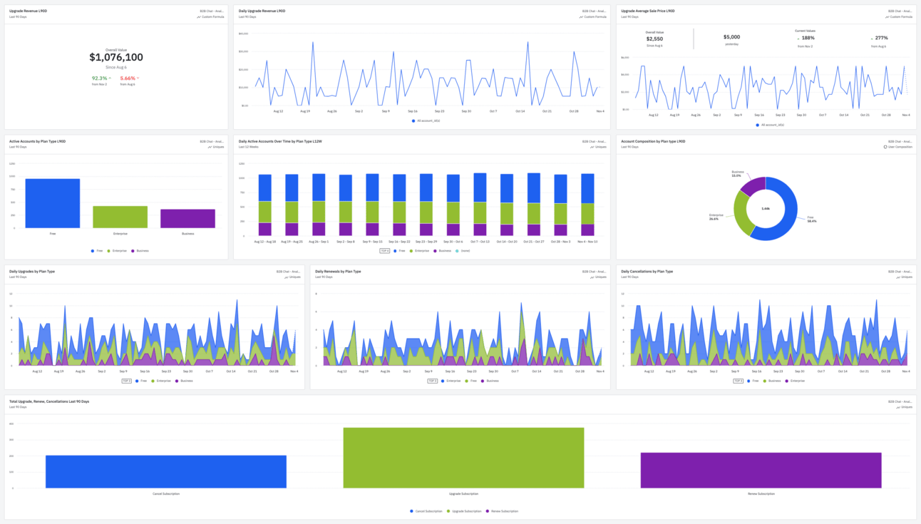 Daily Upgrades by Plan Type: This stacked area chart shows daily upgrades by plan type over the last 90 days. It complements the "Upgrade Revenue" chart by showing daily volumes, and helps identify the most popular plans for upgrades and any patterns. I use this to spot anomalies. Unexpected spikes or dips would trigger further analysis into product updates, pricing changes, offers, or customer success initiatives.