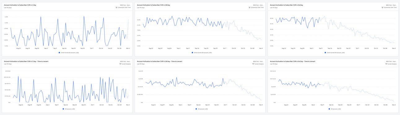 Account Activation to Subscriber Conversion Rate (in 1, 28, 56 days): These charts show overall conversion rate trends, but cohort analysis is necessary for deeper understanding. They’re good at revealing the impact of activation criteria or onboarding changes, ahead of lagging retention impact.