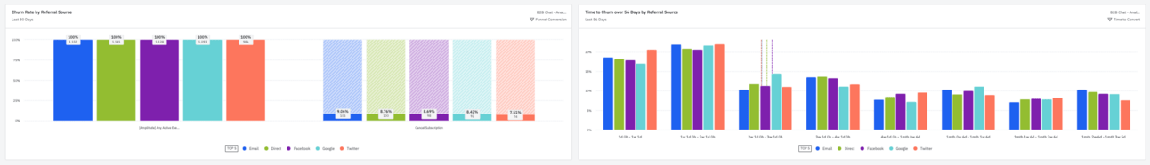 Time to Churn over 56 Days by Referral Source: This chart shows the time to churn distribution for different user acquisition sources. Useful for identifying anomalies and typical churn periods for targeted intervention strategies.